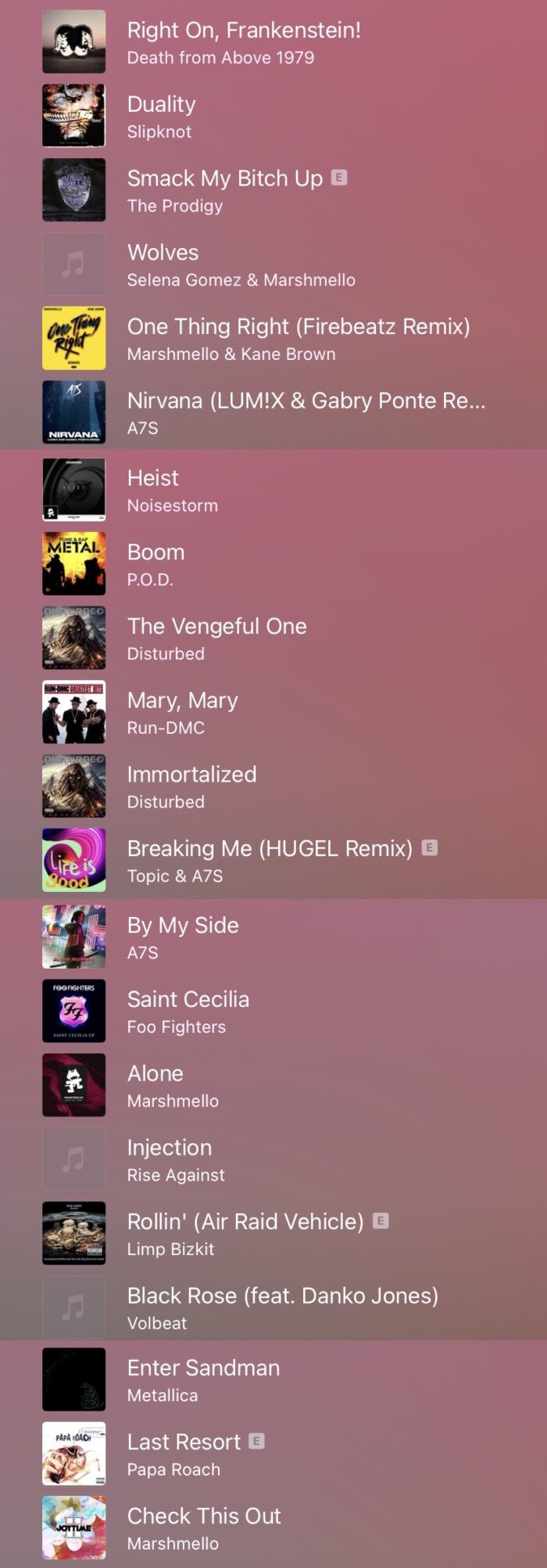 And speaking of this mix, if you have any suggestions for songs in this flavour/emphasis/speed — everything from rock to metal to EDM — please do let me know. My current list is only about twice as long as the played songs shown here, and particularly if I’m walking for distance, I could do with more in this pool to pull from. (And speaking of pool, I’m not sure why Bodies by Drowning Pool isn’t in there. I’ll have to try that out…)